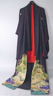 Blue ground, white mallow leaf medallions to shoulder, the lower half worked to show green foliate bands of lotus ponds and open fans.