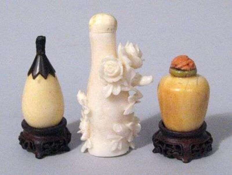 Two ivory snuff bottles and a white coral carved snuff bottle late 19th century