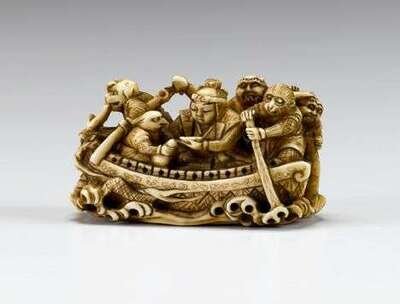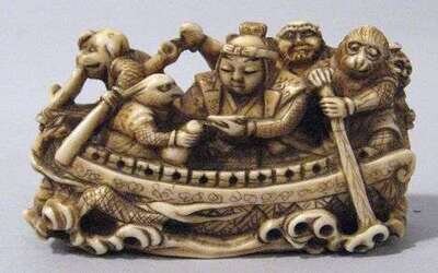 Of long rectangular form, carved to show various animal and figural forms in a long boat.