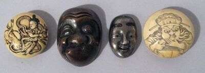 Two oval manju signed in low relief, four oval ojime, one scull form ojime, together with a bronze and white metal mask.