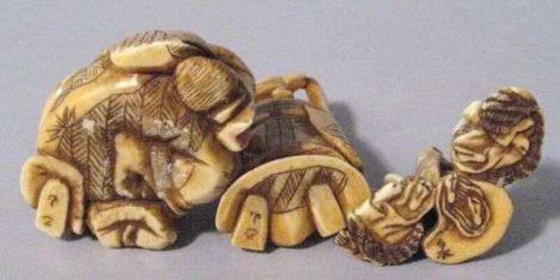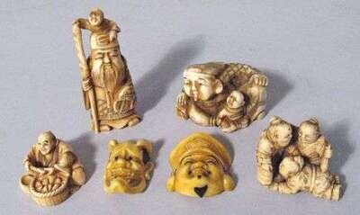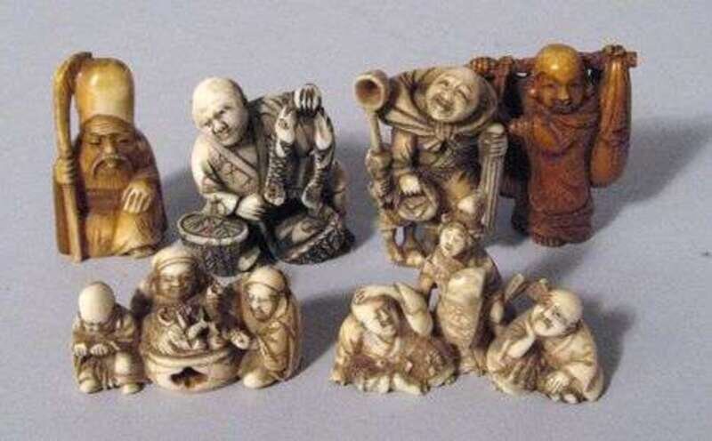 Four signed, comprised of various figural groupings, together with two resin Noh masks.