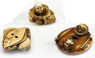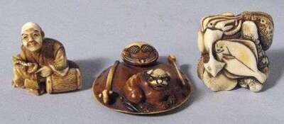 Three Japanese elephant ivory netsuke signed ippo & soguoku, 19/20th century