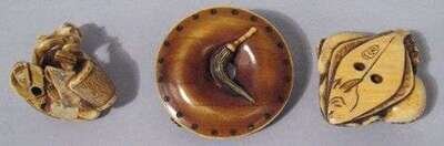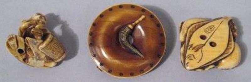 Comprised of a signed square flounder, squid and clam grouping, a medallion surmounted by kishi and gong, together with a seated figure.