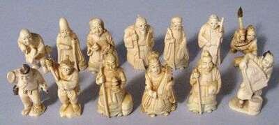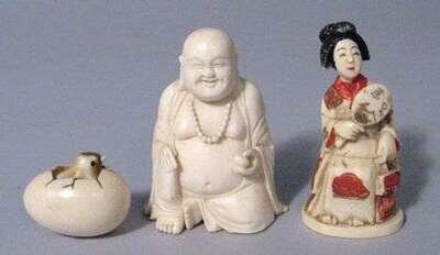 Including a fine chicken egg form netsuke, together with twelve figural okimono.