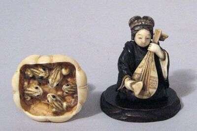 The seated musician wood and ivory snuff bottle is worked holding a string instrument, together with a ivory netsuke of lotus leaf form supporting five frogs.