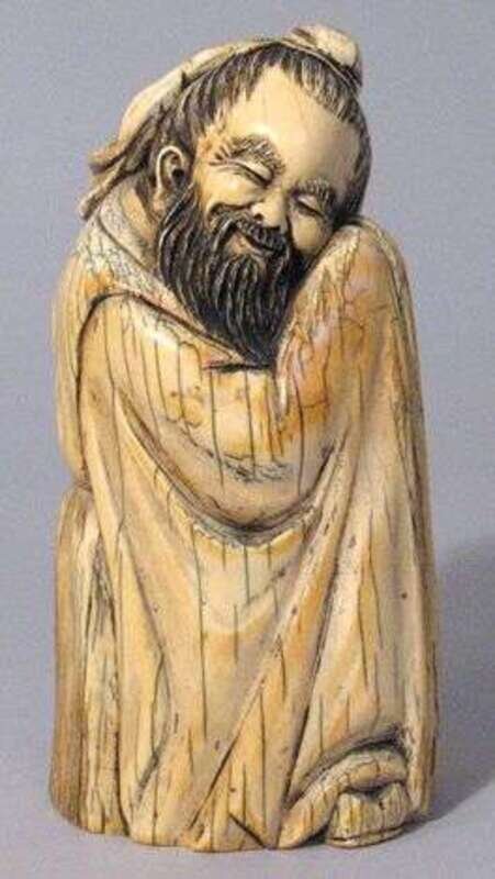Carved from a single tusk, elderly scholar modeled with head resting on a fully robed body, incised mark to base, good patina.
