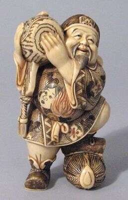 The well carved colored ivory figure is modeled as a male figure supporting a wood barrel.