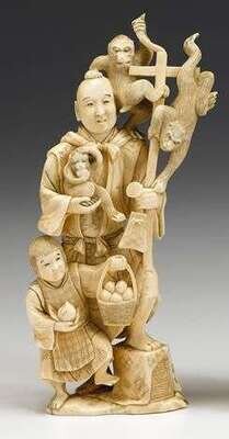 The tall man figure stands supporting three monkeys, with a child by his side grasping a peach and basket.