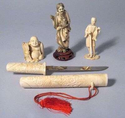 Three Japanese ivory okimono and bone cased tanto 19/20th century