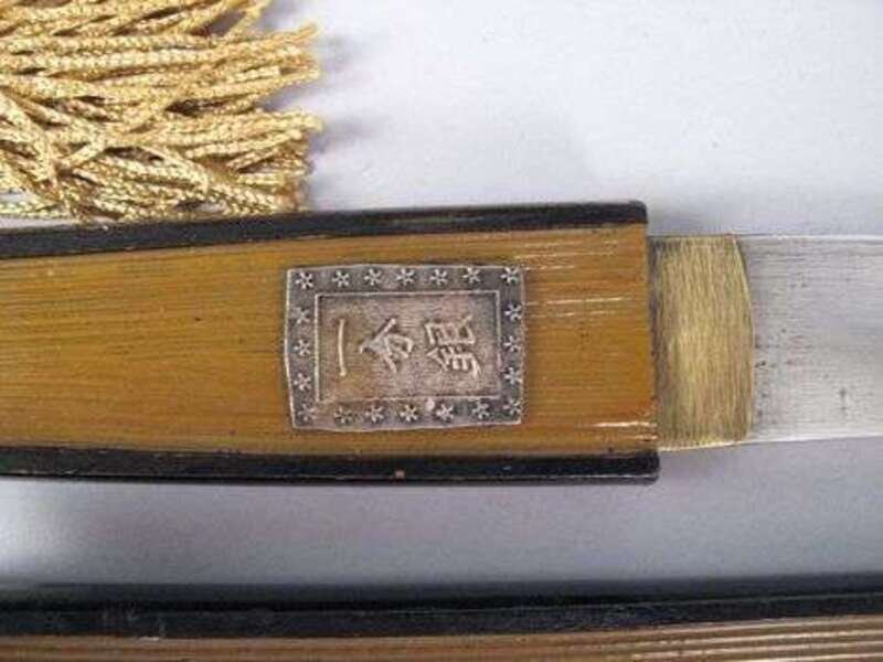 curved blade, no visible hamon, lacquered wood saya and handle modeled as a fan.