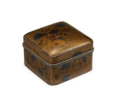 Of square flush-fitting cover and pewter rim, togidashi-e and hiramaki-e over nashiji ground showing floral sprig ascended from rock-work.