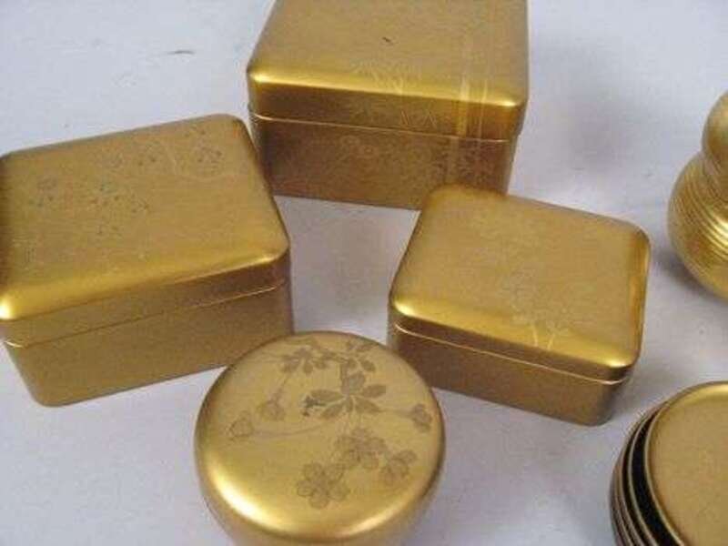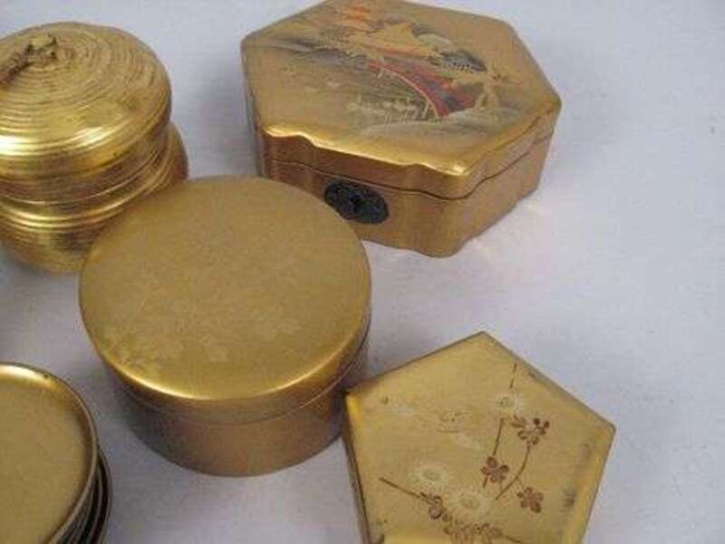 Including a trio of graduating 'three friends' hiramaki-e decorated boxes, a turned gourd form box, two circular boxes one enclosing six trays, signed Aizu Wakamatsu, a hexagonal gold, red and silver takamaki-e box, together with a small similar shaped box depicting song birds.