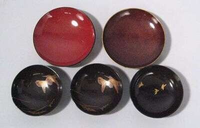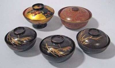 Set of two signed Japanese lacquered covered bowls and three covered bowls 20th century