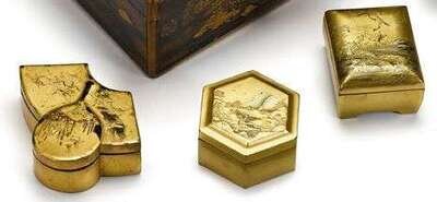 The largest of rectangular form, togidashi-e and hiramaki-e on gold ground showing geese in flight over detailed waterway, a hexagonal shaped takamaki-e and kakeme on gold ground decorated kogo, together with a similar box all with orange-gold maki-e to interior.