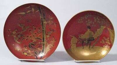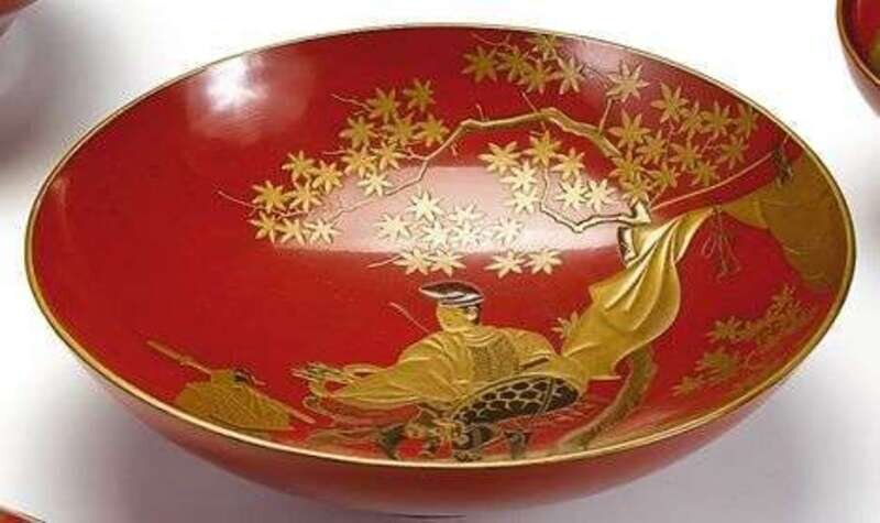 The largest of shallow U-shape over a tapered cylindrical foot is decorated in gold and black hiramakie on red ground, together with a similar formed bowl over a short foot decorated in gold, red and brown takamakie, on red ground depicting horseman and attendant on a hiramakie gold landscape.