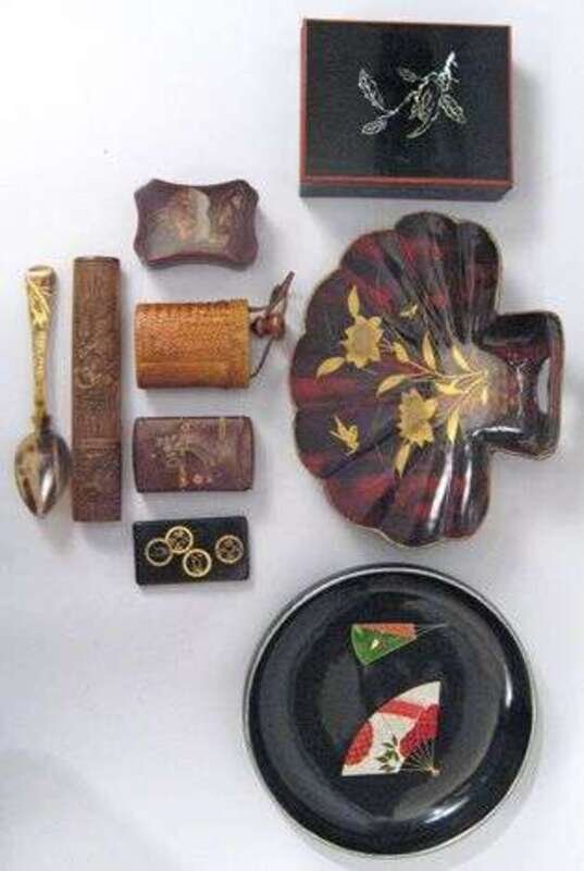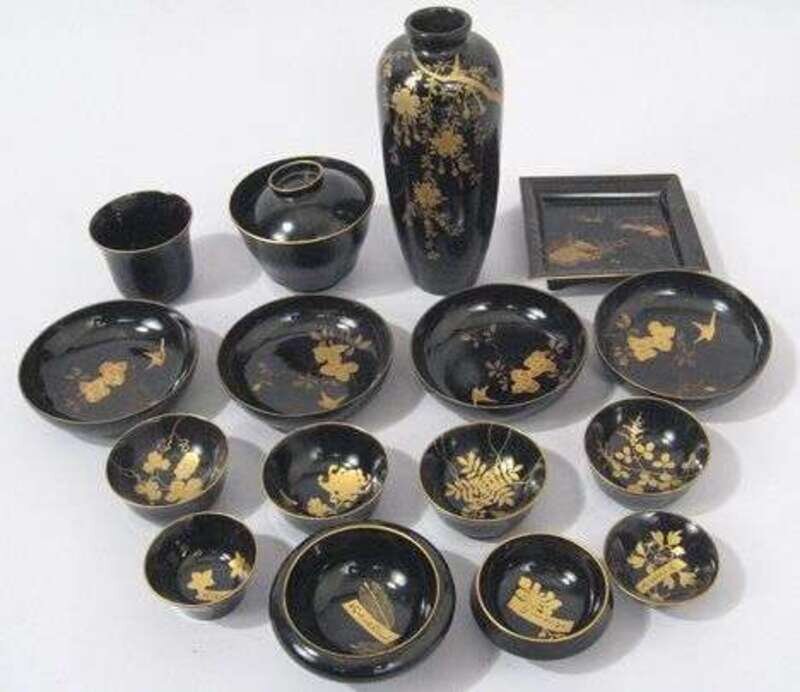 Comprised of a gold hakeme on roshuku-nuri vase, raden rectangular box, heigaki decorated circular tray and collection of other japanese table items.