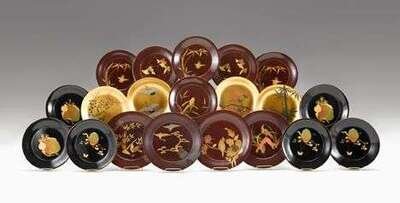 Comprising of a set of four thick hakeme decorated gold ground dishs depicting bamboo sprigs, egrets, chrysanthemum sprigs and a maple branch changing color, likely depicting the four seasons, set of six small hakeme of gold, silver and brown on tamenuri ground depicting song birds and floral sprigs, together with a similar set of four larger dishes, and lastly six gold and color hakeme on roshoku nuri ground depicting fruit and floral sprigs.