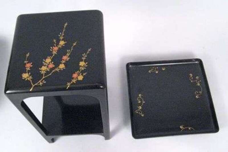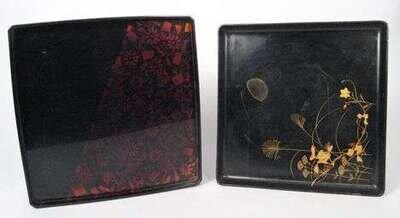 The tall square takamakie decorated to show a floral sprig on roshoku-nuri, together with three roshoku-nuri ground trays.