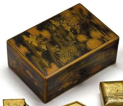 Of rectangular form, the removable cover decorated with gold hakeme and hiramaki-e depicting a peacock among a running stream and silver and orange powder foliate sprigs , continuing to the deep base, densely gold hiramaki-e interior, and base.
