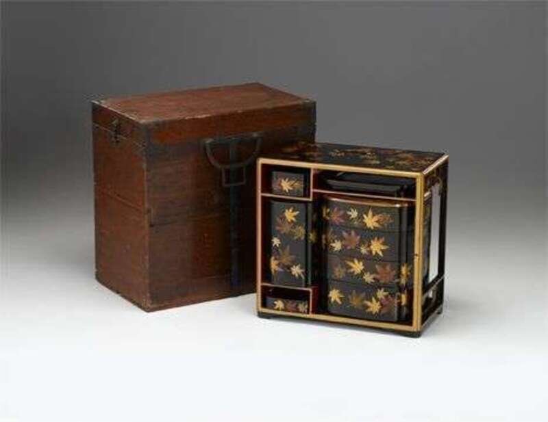 The square case encloses two tall walled trays, a flat tray, four tier box, and water container all worked in hiramaki-e and hakeme to show amber, gold and brown maple leaves on a roshoku nuri, metal fittings, and original tomobako.