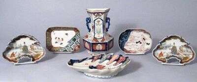 Comprised of a vase form wall sconce, pair of well painted ruyi shaped trays, together with three similar decorated trays.