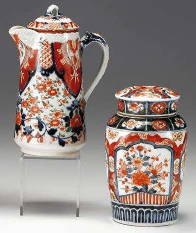 Comprised of a molded tall European modeled tea pot, together with a covered and lidded ovoid caddy, both painted in the imari palette.
