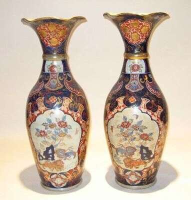 Of baluster form, scolloped rim and slender neck, painted in the typical imari palette.