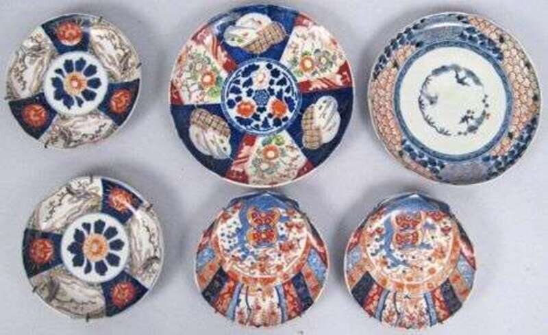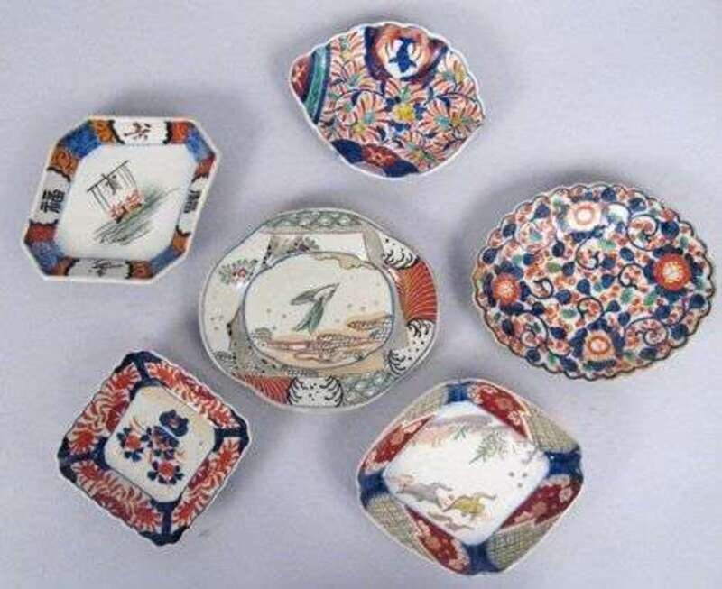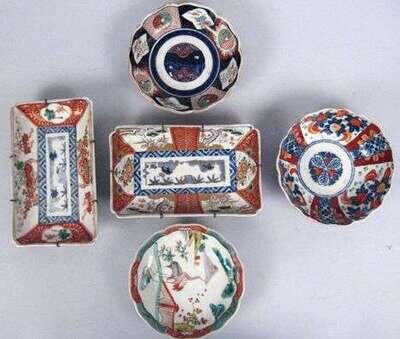 Comprised of pairs of trays and single molded trays painted in the imari palette.