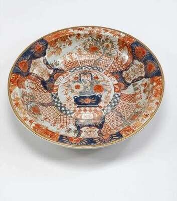 Of slightly rounded form, painted in the imari palette to show a central medallion of vases issuing floral sprigs.