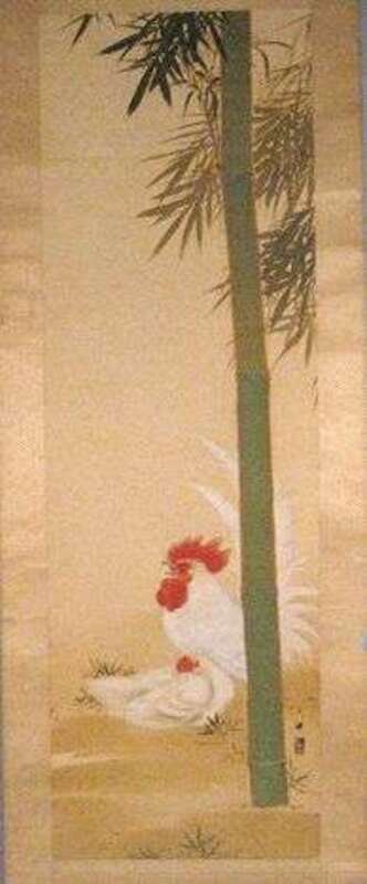 Typical tall rectangular form, color wash and ink on paper, depicting two chickens below a bamboo grove, script and seal mark, together with tomobako.