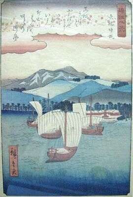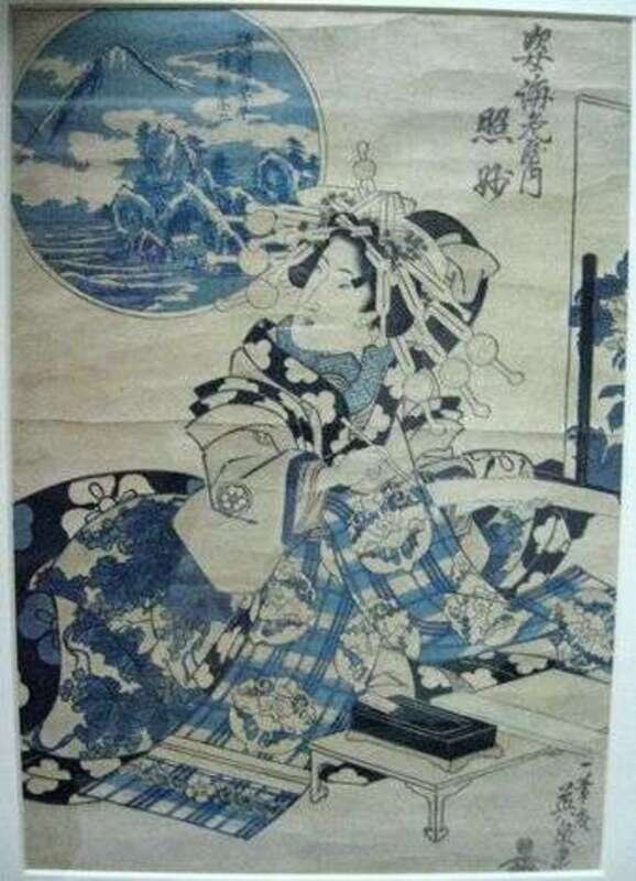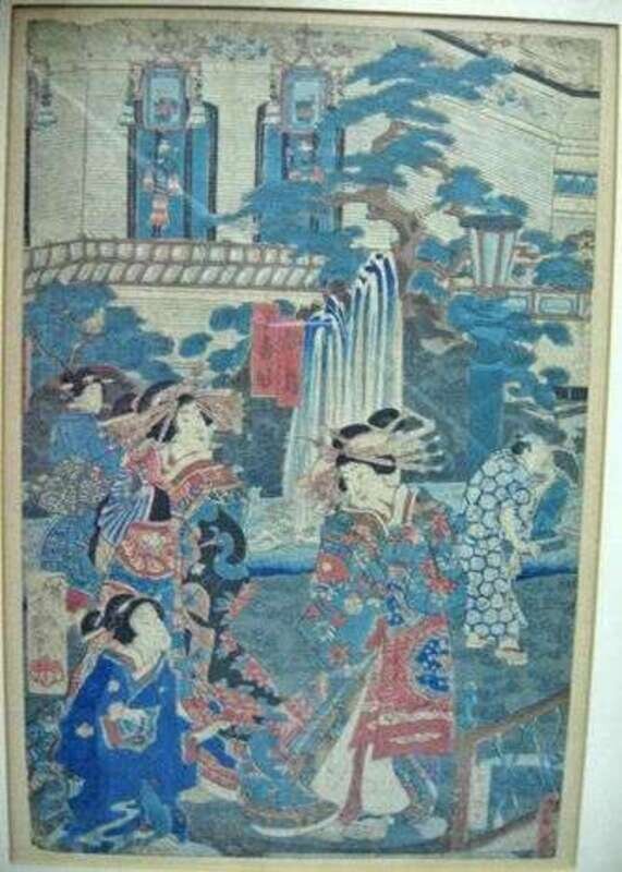 Sadahiro Utagawa (active 1825-75), "Bijin" signed Sadahiro and with artist's seal. Eisen Ikeda (1790-1848), "Bijin" signed keisai Eisen ga with kiwame and publisher's seals; Tsutaya Kichizô, publisher. Kunisada Utagawa (1786-1865), "Bijin with Attendents" signed kochoro Kunisada ga and with kiwame seal. Yoshiiku Utagawa (1833-1904), "Four Bijin Near a Pond with Cascades" signed ikkeisai Yoshiiku ga and with kiri seal. Together with a late edition print of "Five Boats Returning to Yabase" by Hiroshige.