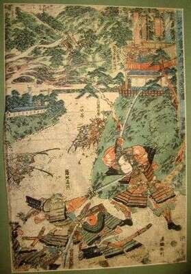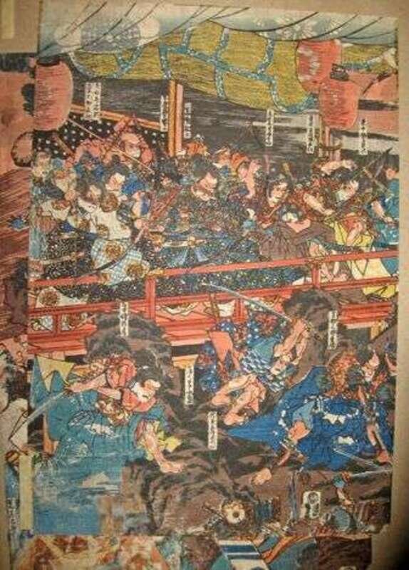oban tate-e; together with four other color woodblock prints from incomplete triptychs by various artists.