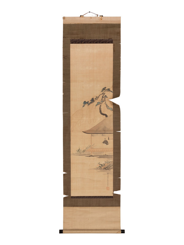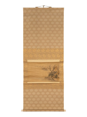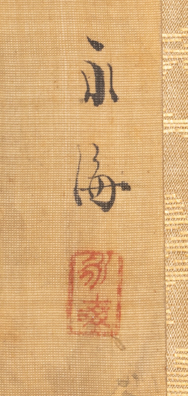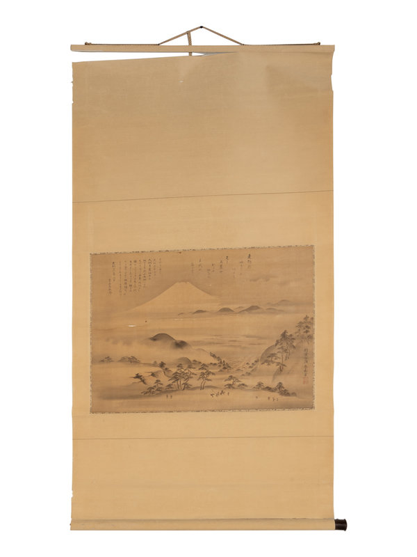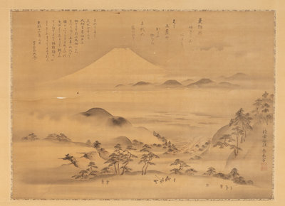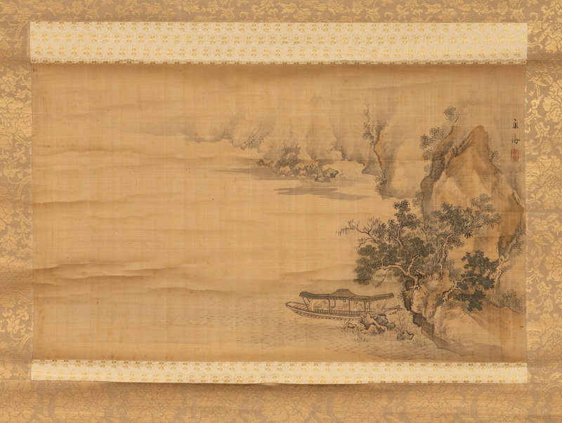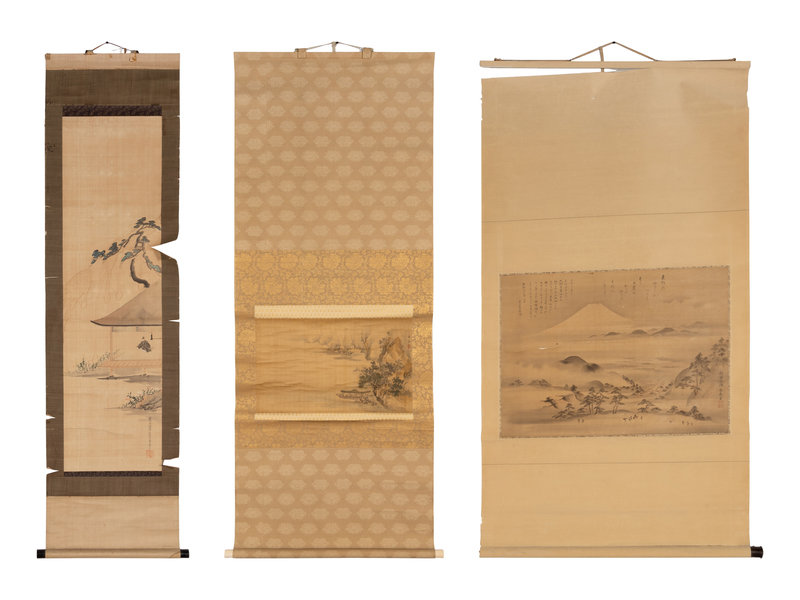 the first depicting a boat by the riverbank, the second depicting mount Fuji, the last depicting landscape.