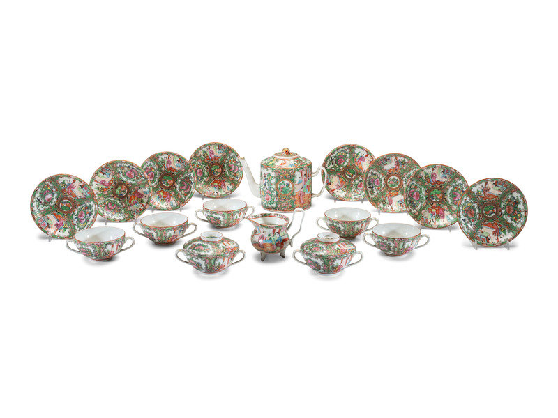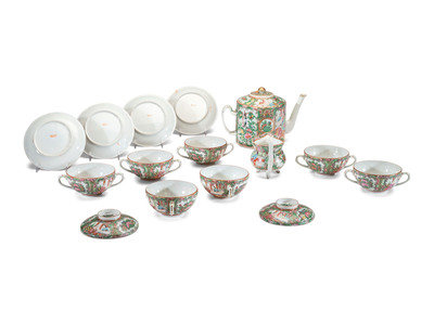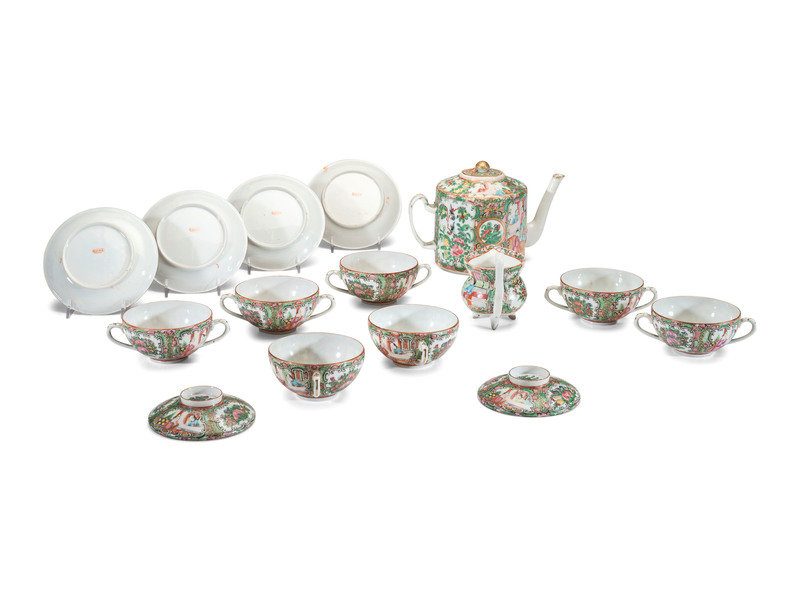 comprising a teapot, a creamer, eight saucers and seven cups (two with covers).