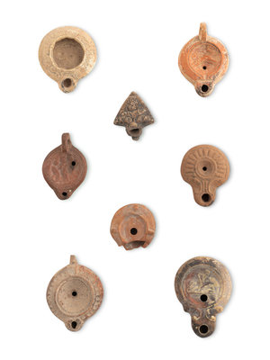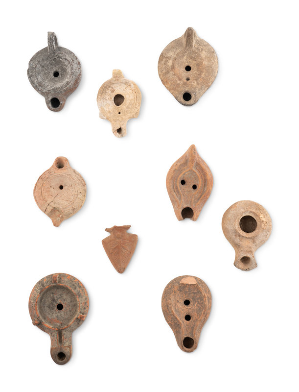 A Group of Seventeen Roman Oil Lamps and Lamp Handles