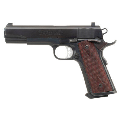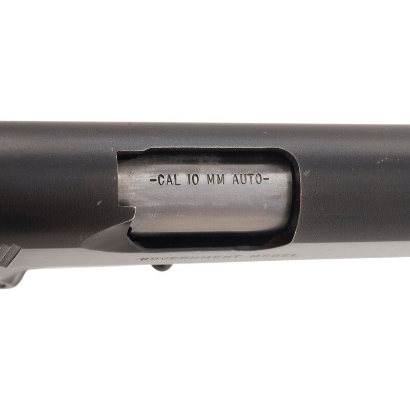 10mm Auto. 5" barrel length. SN: DE17929. Blued metal refinish overall with diamond checkered Cocobolo grips and mounting triple dot Trijicon tritium night sights. Short recoil operated single action autoloading pistol fed by detachable single stack magazines. Item mounts an adjustable speed trigger with numerous custom components including: skeletonized Commander hammer, extended safety lever, raised and enlarged magazine release, Ed Brown Memory Line pattern grip safety, and a checkered one piece flat mainspring housing/flared magazine well extension. The markings include standard DELTA ELITE/COLT {10mm within triangle} AUTO to the left slide and GOVERNMENT MODEL to the right. The frame displays Colt's VP monogram proof and a single line address to the right frame. Comes with one blued magazine with synthetic baseplate. A sheet metal spacer has been installed to the barrel link.