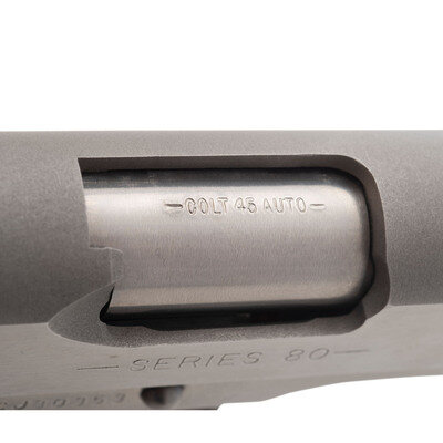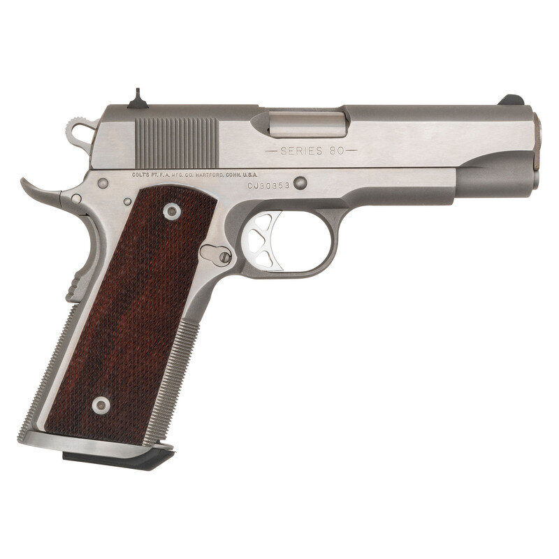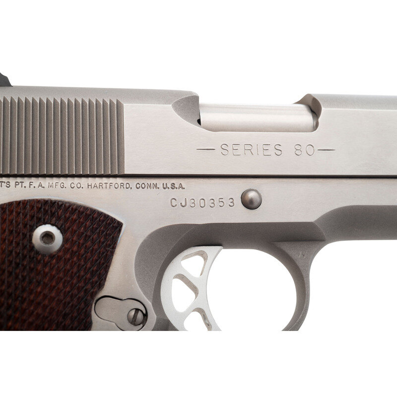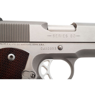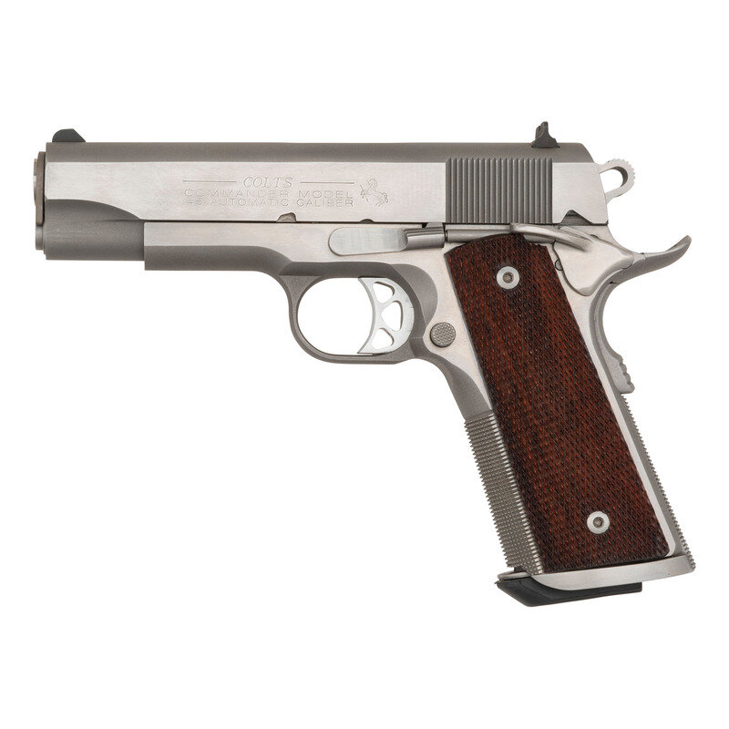 .45 ACP. 4.25" barrel length. SN: CJ30353. Matte stainless finish to the rounds with brushed finish on the flats and mounting checkered walnut grips with. Single action short recoil operated autoloading pistol fed by detachable single stack magazines. Item has been customized with Ed Brown Memory Line pattern extended beavertail grip safety, a knurled combination flat mainspring housing and flared magazine well extension, knurled front gripstrap, and relief cut to the underside of the triggerguard to permit a higher grip. The handgun mounts a skeletonized Commander hammer, extended safety lever, raised magazine release, and mounts fixed triple white dot sights. A full recoil spring guide with synthetic buffer is installed in the slide, and all the edges of the firearm have been deburred for snag free carry. Left slide is marked COLT'S/COMMANDER MODEL/.45 AUTOMATIC CALIBER followed by the {Rampant Colt} logo. The right slide is marked SERIES 80, and the right frame shows the standard single line Colt address marking. Comes with one stainless steel finish magazine with synthetic baseplate showing the MF monogram marking of Metalform.