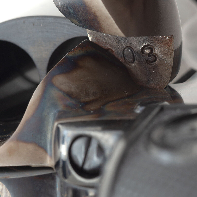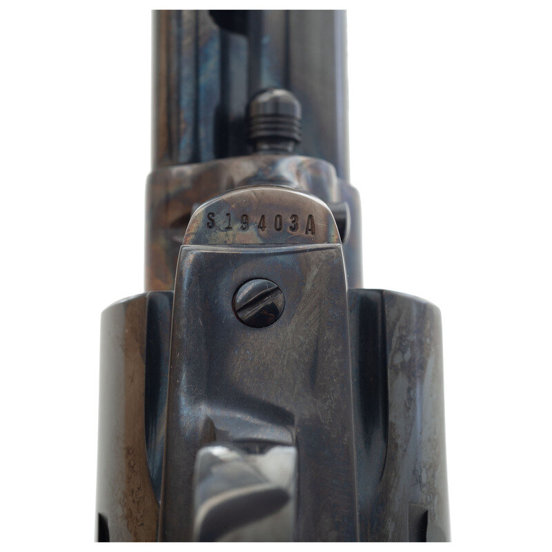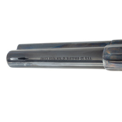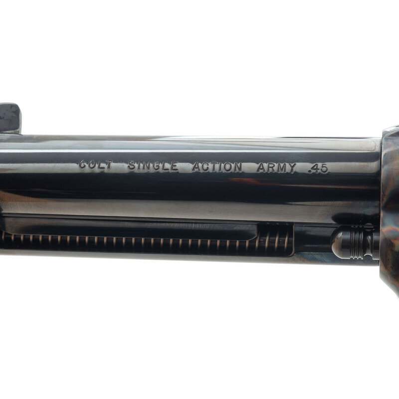 .45 Colt/.45 ACP. 4" barrel. SN: S19403A. Blued and color casehardened finish, hard rubber Eagle motif grips. Single action solid frame cartridge revolver with loading gate, frame notch rear sight, blade front sight, smokeless powder frame and six-chambered fluted cylinder. Revolver appears to be "as new" in box. The gun includes the original blue cardboard Colt factory box with foam interior as well as all factory paperwork and the spare .45ACP cylinder, still in wrapped in paper.