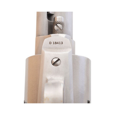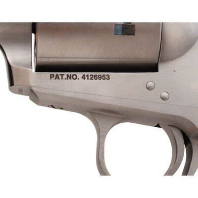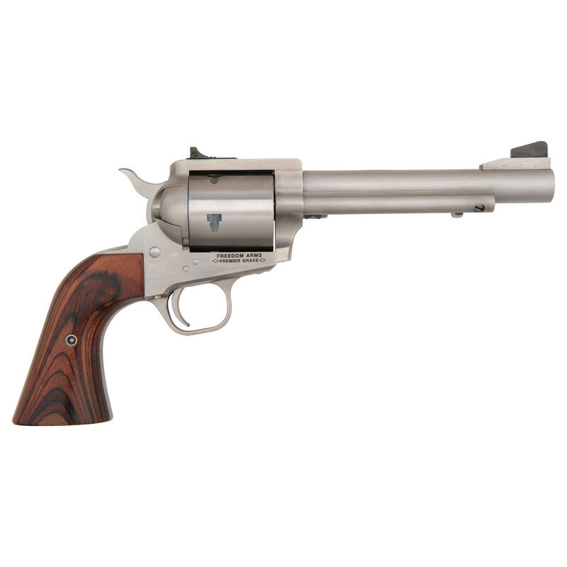 .454 Casull. 6" barrel length. SN: D18413. Brushed stainless steel finish overall mounting two-piece laminated wood grips and fitted with adjustable target rear notch and matted front blade sights. Single action loading gate revolver with spring loaded ejector rod following the pattern of Colt's Single Action Army revolver. Left barrel is marked FREEDOM ARMS MODEL 83 454 CASULL/FREEDOM, WYOMING U.S.A. and the left frame shows PAT.NO. 4126953. Right frame is marked FREEDOM ARMS/PREMIER GRADE. Item comes in its original cardboard box with accessories including a CHAMBER-SAFE lock with keys, owner's manual with inserts, factory test target, and a serial number matching .45 ACP cylinder.