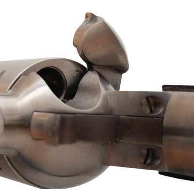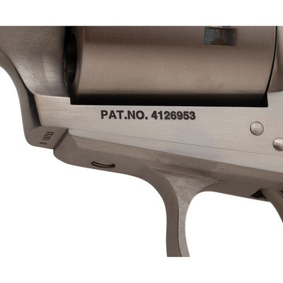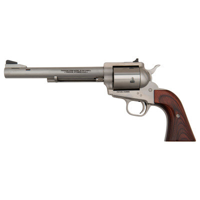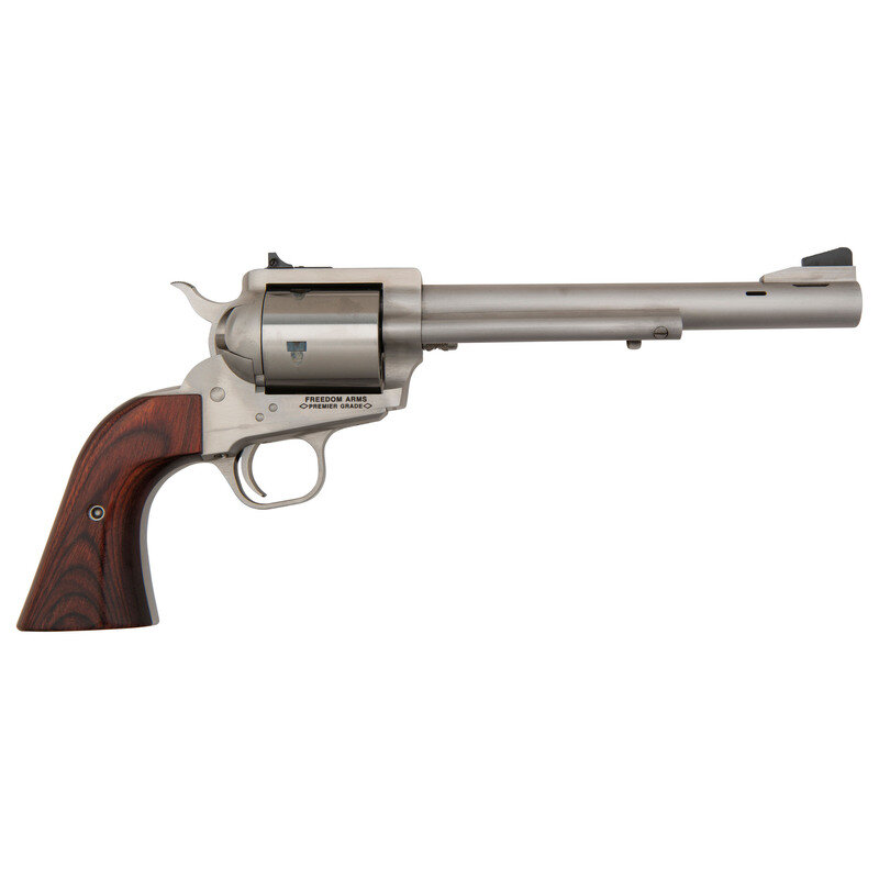 .454 Casull. 7.5" barrel length. SN: D18753. Brushed stainless steel finish with laminated wood two-piece grips and mounting adjustable target rear notch and matted front ramp sights on a ported barrel. Single-action loading gate revolver with six shot cylinder and three cylinder options. Left barrel shows the model marking FREEDOM ARMS MODEL 83 454 CASULL/FREEDOM, WYOMING U.S.A. with the left frame showing patent mark PAT.NO. 4126953. Right frame is marked FREEDOM ARMS/PREMIER GRADE. Comes in its original cardboard box with accessories including: CHAMBER-SAFE lock with keys, owner's manual with inserts, factory test target, .45 ACP cylinder, and .45 Colt cylinder. Both of the cylinders come in leather pouches and show serial numbers matching the frame.