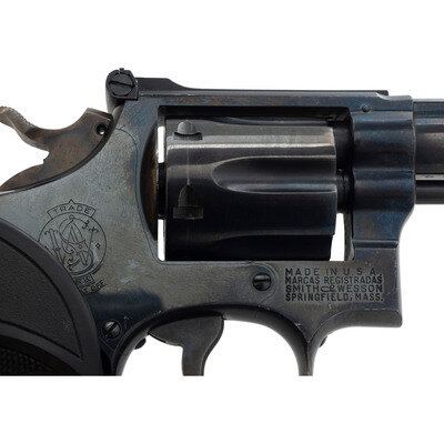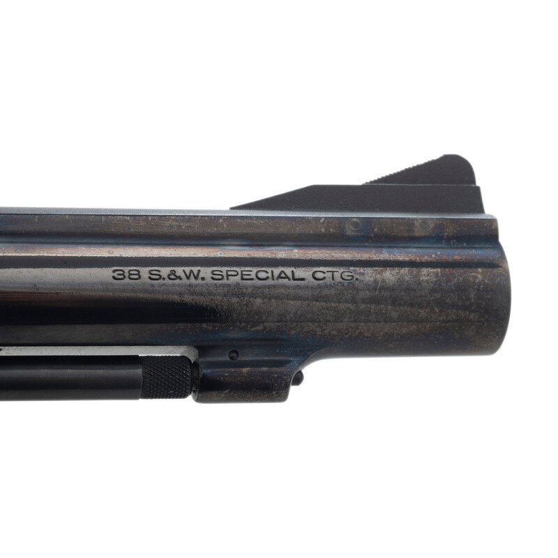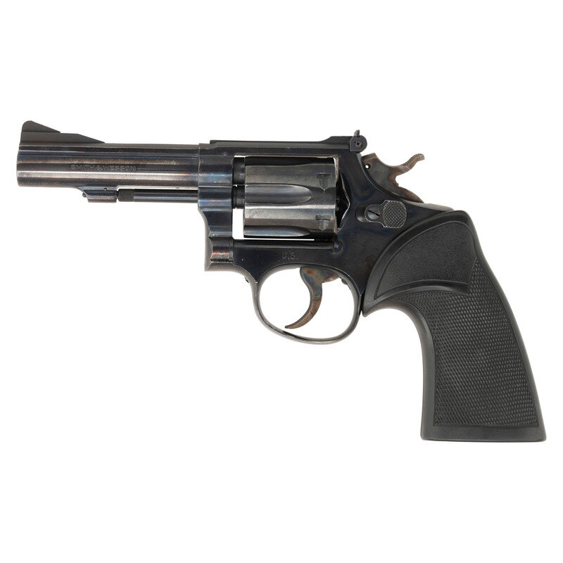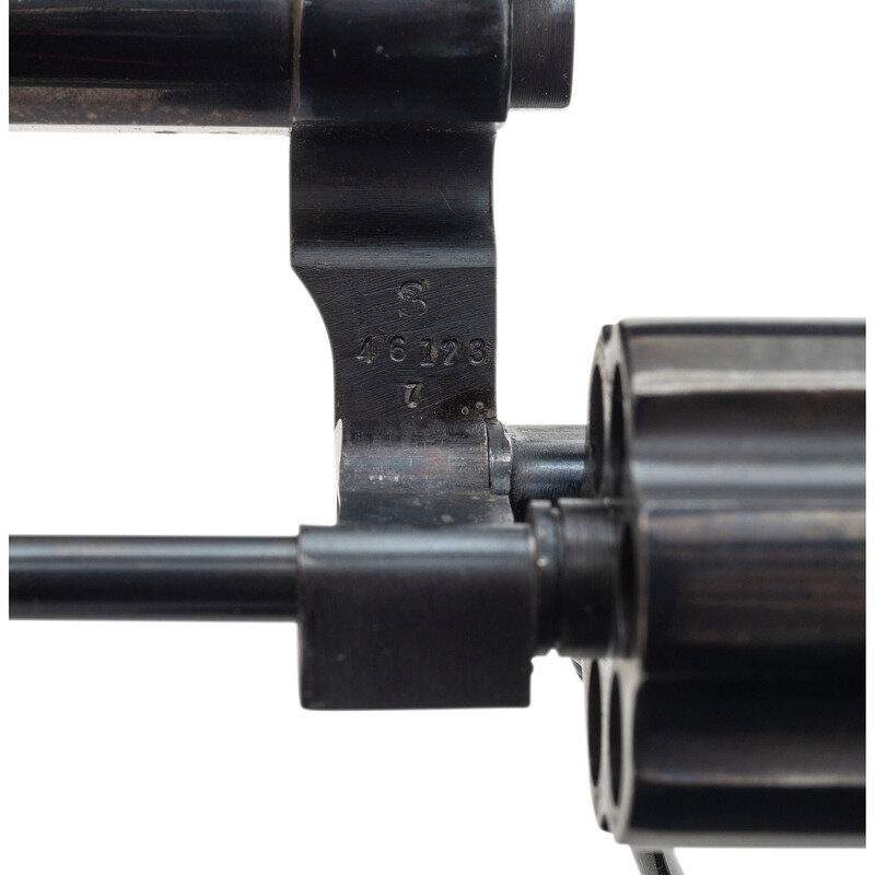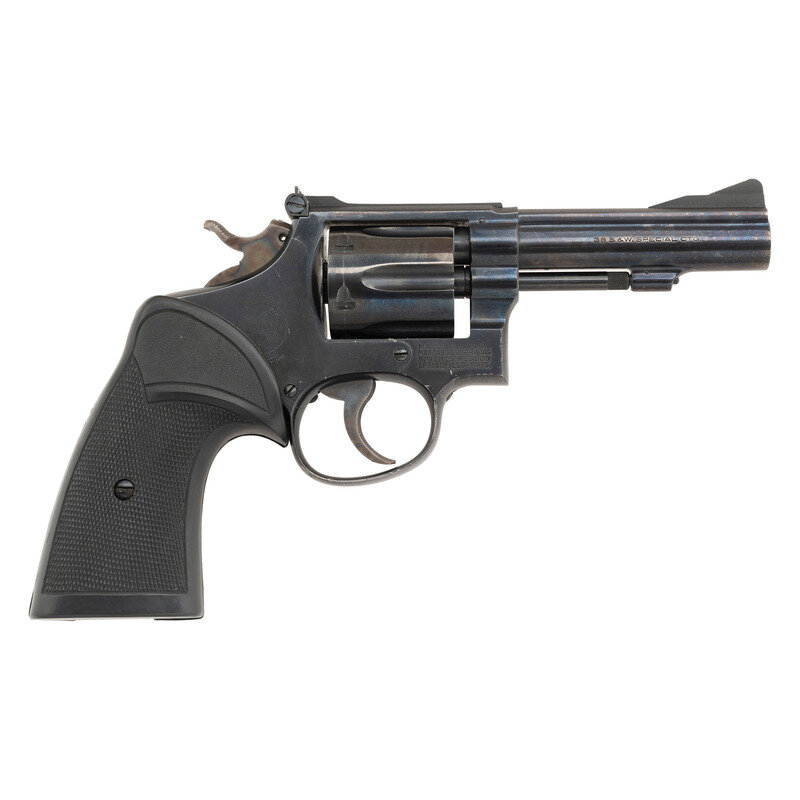 .38 Special. 4" barrel length. SN: K271289. Blued metal finish overall with casehardened hammer and trigger mounting black rubber Pachmayr grips. Double action hand ejector revolver mounting a heavy barrel with full length matted rib and adjustable rear target notch and matted front ramp sights. Item features a pinned barrel, four screw frame, and hammer mounted firing pin. The serial number matches on the frame, cylinder, and star extractor. Further markings include Smith & Wesson monogram trademark to the sideplate, four-line address on the frame, SMITH & WESSON to the left barrel and 38 S.&W. SPECIAL CTG. to the right. The lower left frame has been stamped U.S. Assembly number 46128 appears on the internal frame, and further marks include S initial to the underside of the barrel and inner frame, and K on the rear cylinder.