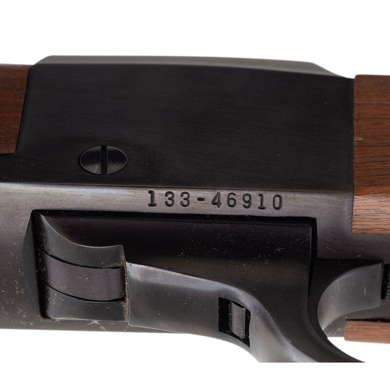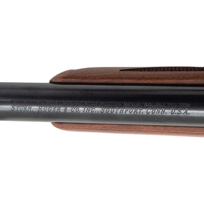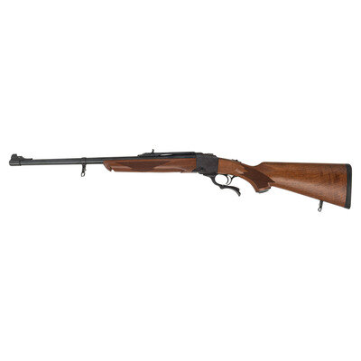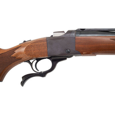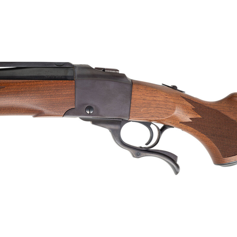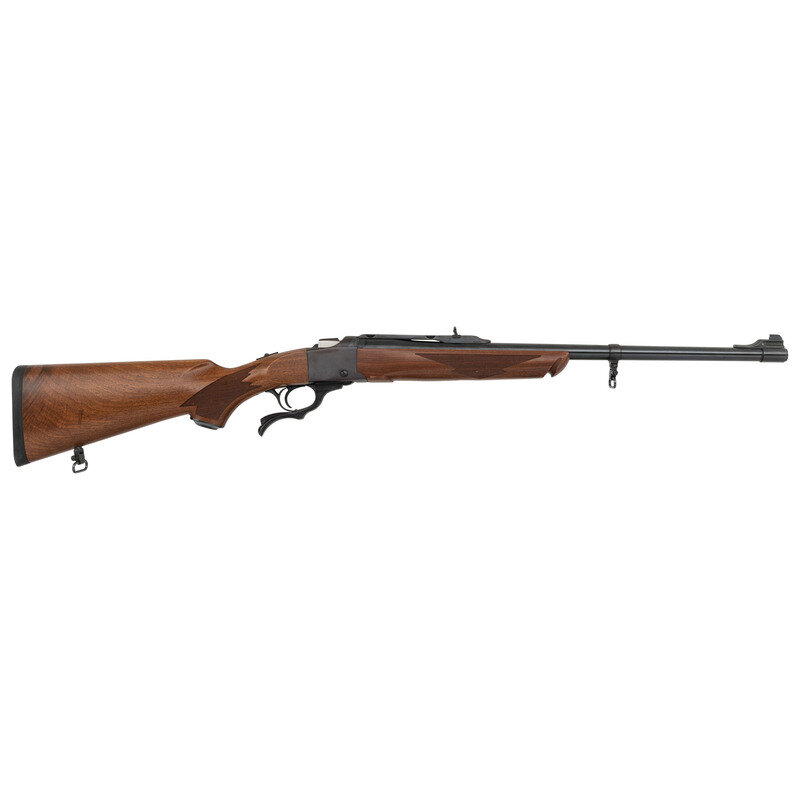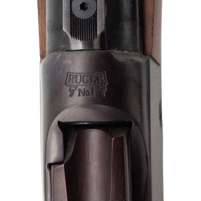 .45-70. 22" barrel length. SN: 133-46910. Blued metal finish and polished breechblock flanks mounting two-piece walnut semi pistol grip stock mounting front and rear sling swivels with the forward swivel mounted onto a barrel band. Single shot falling block hammerless rifle featuring folding rear notch and front blade sights. Rear sight mounted atop a matted scope rail. Standard make and model markings with the top of the frame marked RUGER/No.1. Rifle features a Ruger logo black rubber recoil pad and checkering to the wrist and forend.