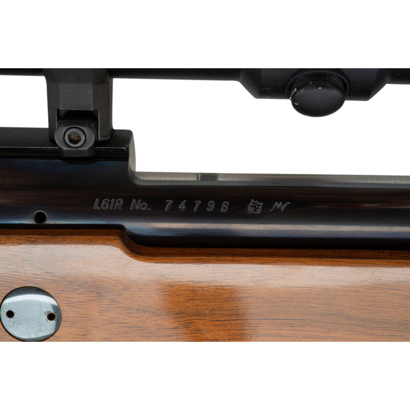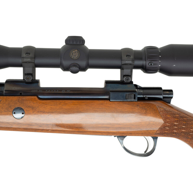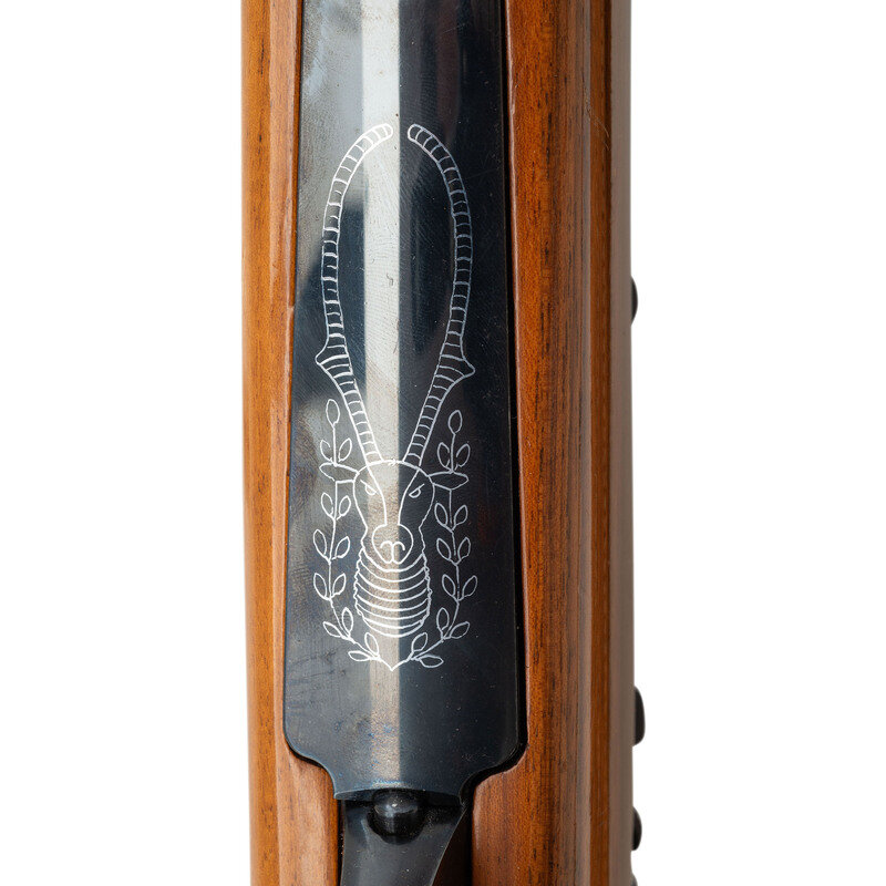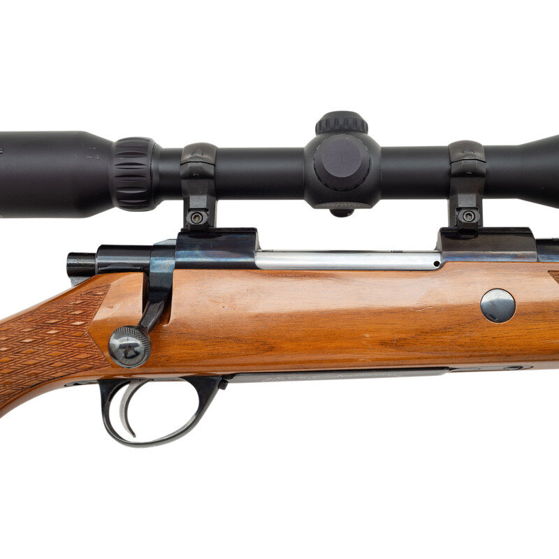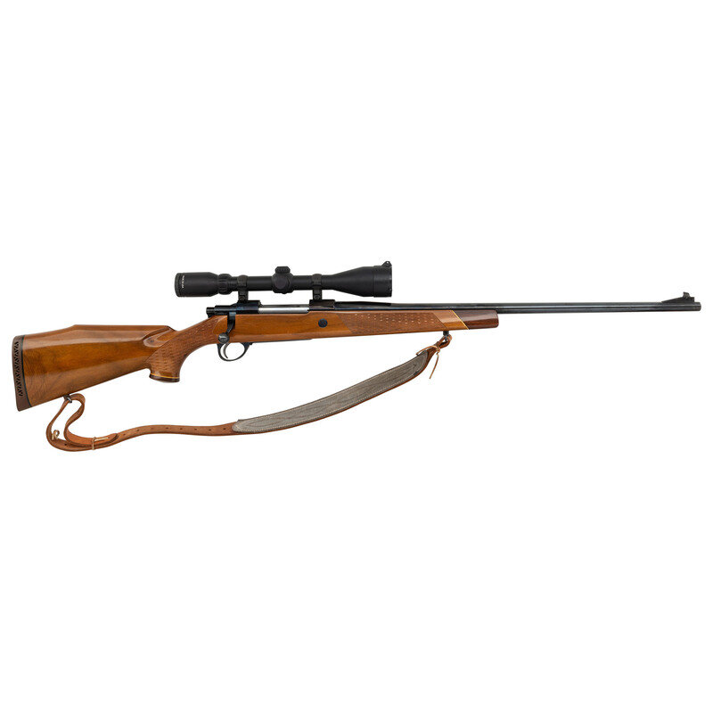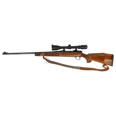 .25-06 Remington. 24" barrel length. SN: 74796. Blued metal finish. French walnut stock has skip-line checkering to semi pistol grip and forearm, with a raised cheekrest and rosewood caps to forend and grip. Bolt action rifle with a Burris 3-12x44mm scope and blade front sight. Item features double sling swivels, vented rubber recoil pad, and an internal box magazine. Includes a brown leather sling and Butler Creek front scope lens cover.