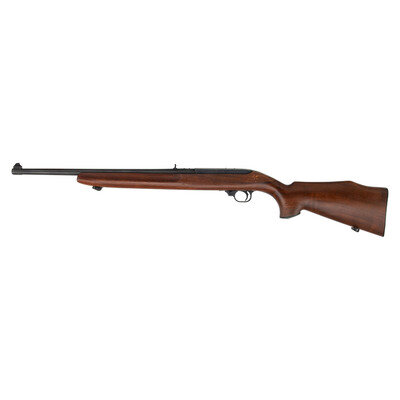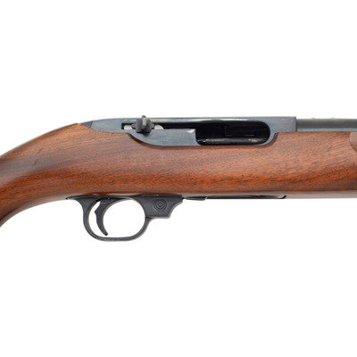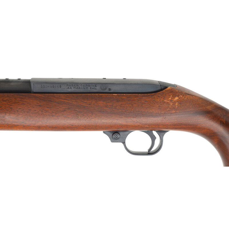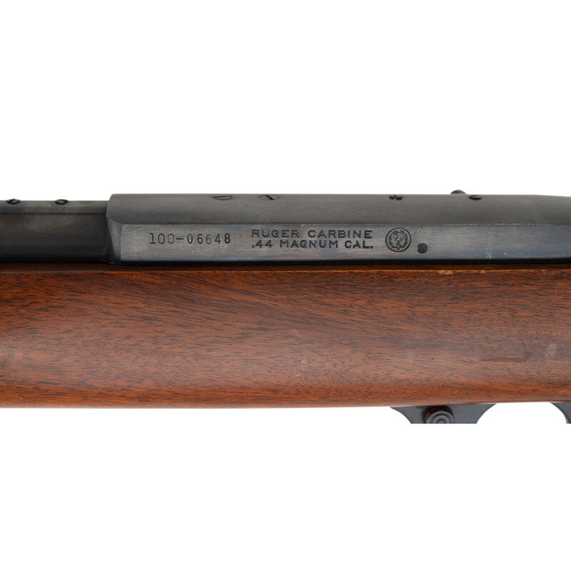 .44 Remington Magnum. 18.5" barrel length. SN: 100-06648. Blued metal finish. Walnut stock has a plain semi pistol grip and forearm with hand grooves. Semi automatic rifle with a folding adjustable notch rear sight and blade front sight. Item features a 4-round magazine. Barrel and receiver are drilled and tapped for scope mounts.