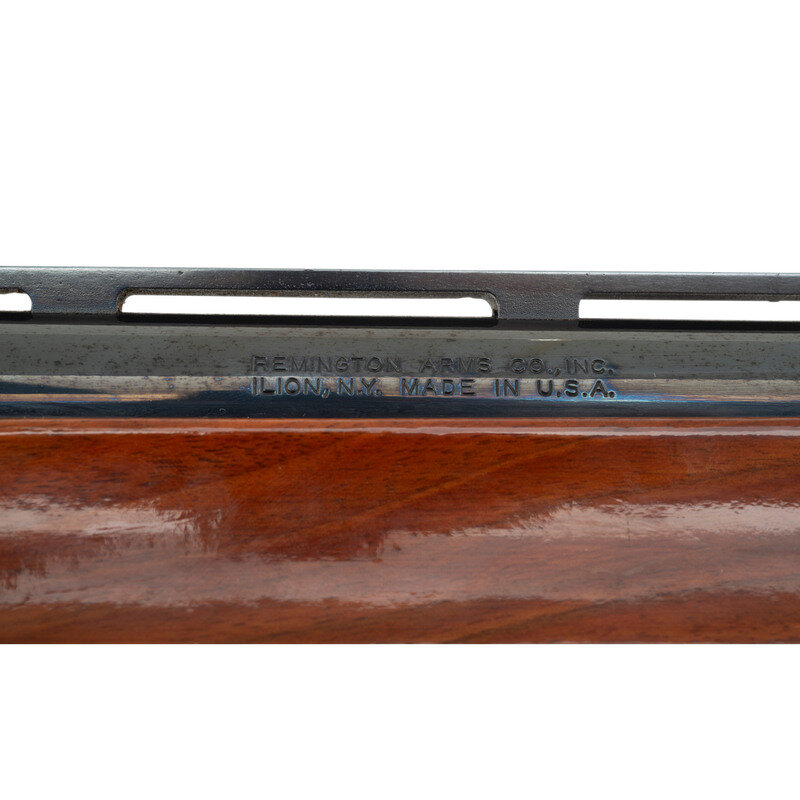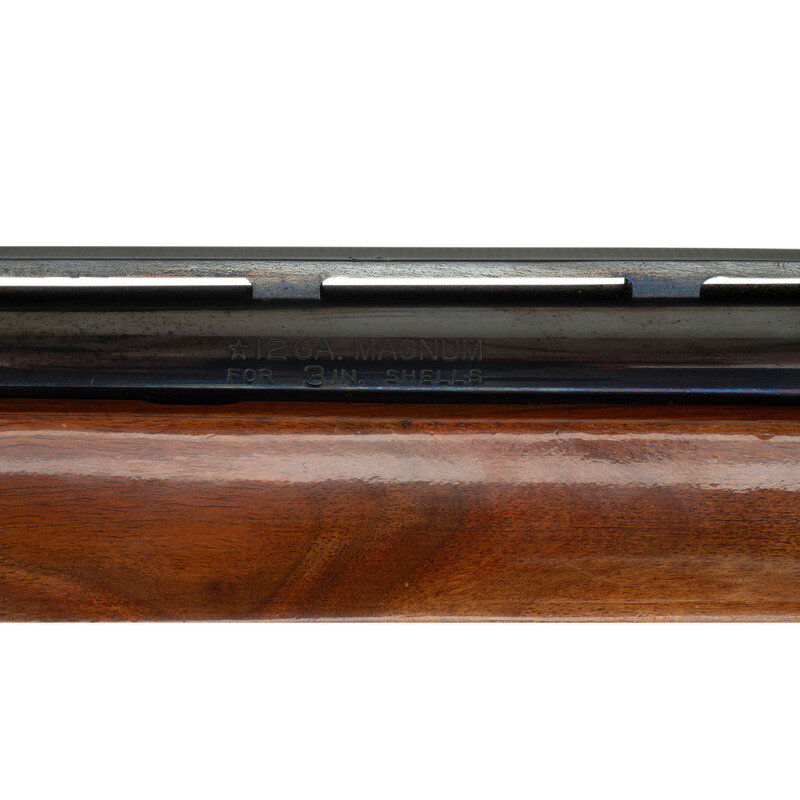 12 gauge. 26" barrel length. 13.75" length of pull. 1.25" drop to comb. 2.25" drop to heel. 3" chamber length. Improved cylinder choke. SN: M374911M. Blued metal finish. Two piece walnut stock has fleur-de-lis checkering to semi pistol grip and beavertail forearm. Semi automatic shotgun with steel bead mid-barrel sight and brass bead front sight. Item features a low vent barrel rib, barrel porting, and a vented rubber recoil pad. Frame and bolt are engraved with simple scroll.