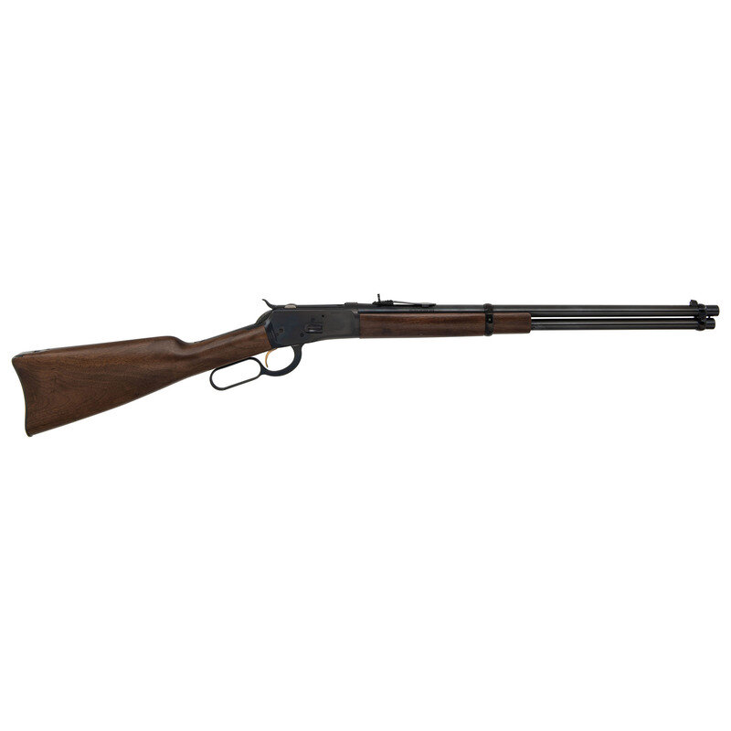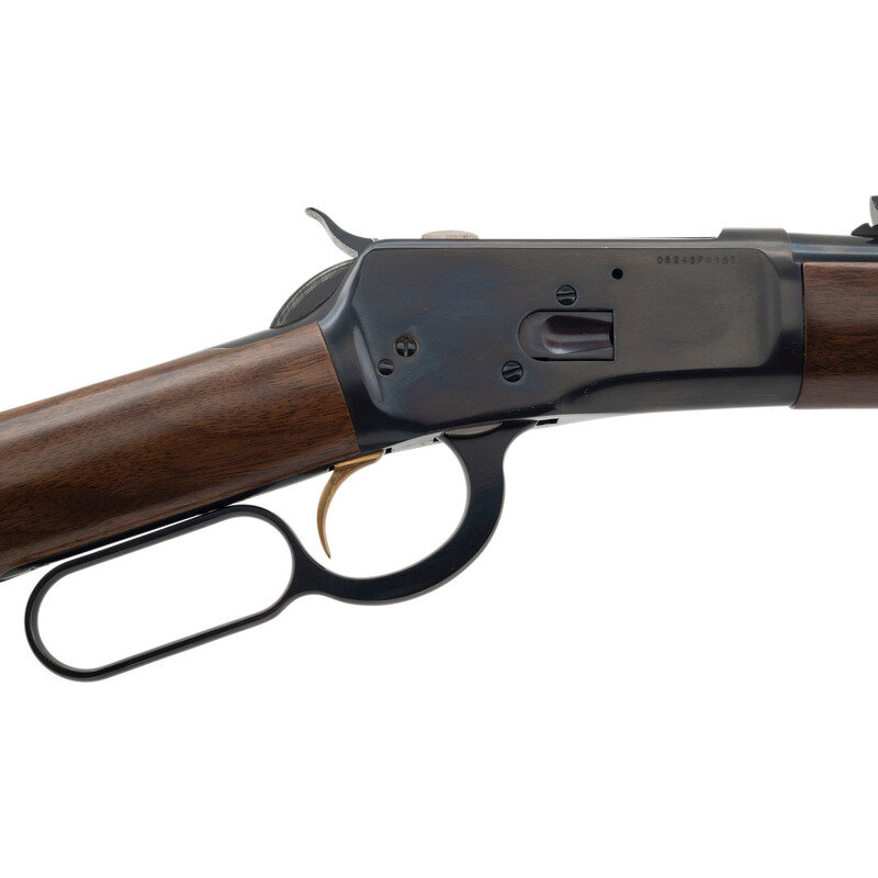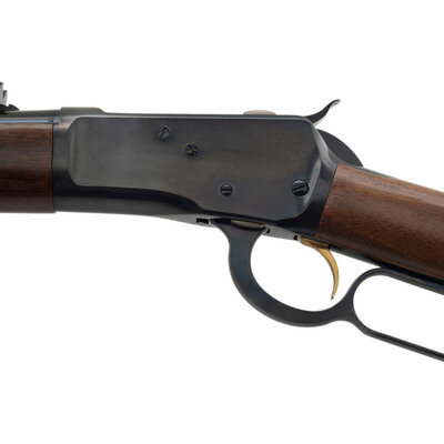 .44 Magnum. 20" barrel length. SN: 06245PM167. Blued metal finish and gold trigger. Two piece walnut stock has a plain straight grip and forearm with single barrel band. Lever action rifle with adjustable semi buckhorn rear sight, blade front sight, and a full tube magazine.
