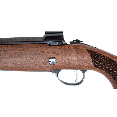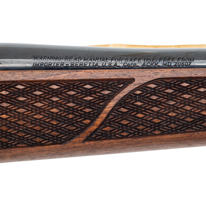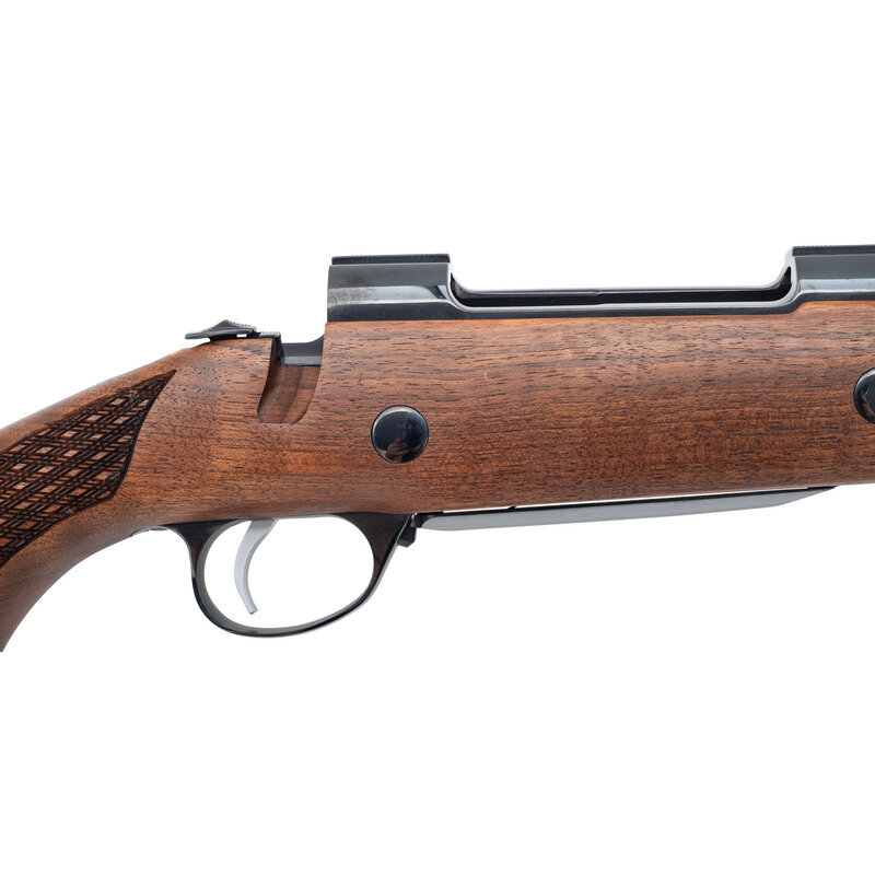 .375 H&H. 24" barrel length. SN: 756852. Blued metal finish. Figured walnut Monte Carlo stock has skip-line checkering to semi pistol grip and forearm, with rosewood caps to forend and grip. Bolt action rifle with express notch rear sight and hooded blade front sight. Item features a rubber recoil pad and double sling studs. Includes original box with scope mounts, locking keys, and owner's manual. Item appears to have never been assembled or fired.