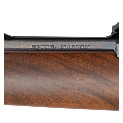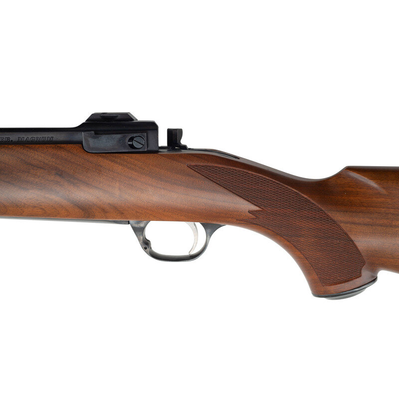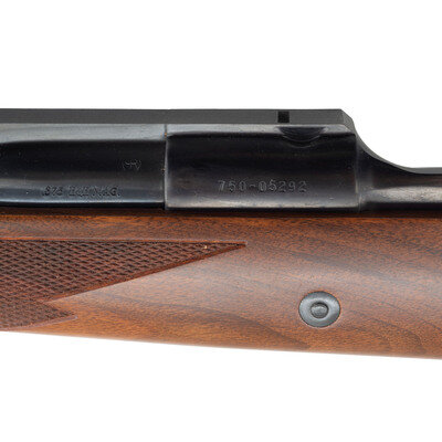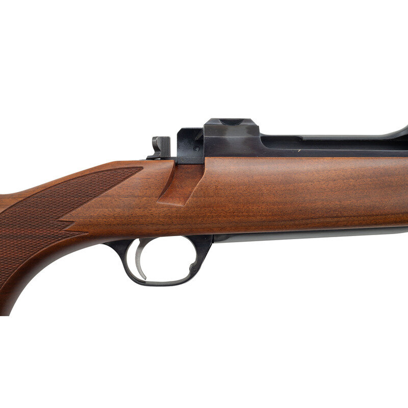.375 H&H. 23" barrel length. SN: 750-05292. Blued metal finish. Walnut stock has checkering to semi pistol grip and forearm, with ebony forend. Bolt action rifle with three leaf folding notch express sight mounted on an integral quarter rib, and blade front sight. Item features an internal box magazine, double sling studs, and rubber recoil pad. Includes original box.