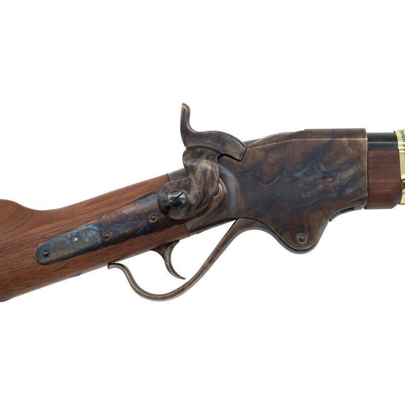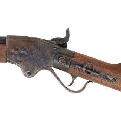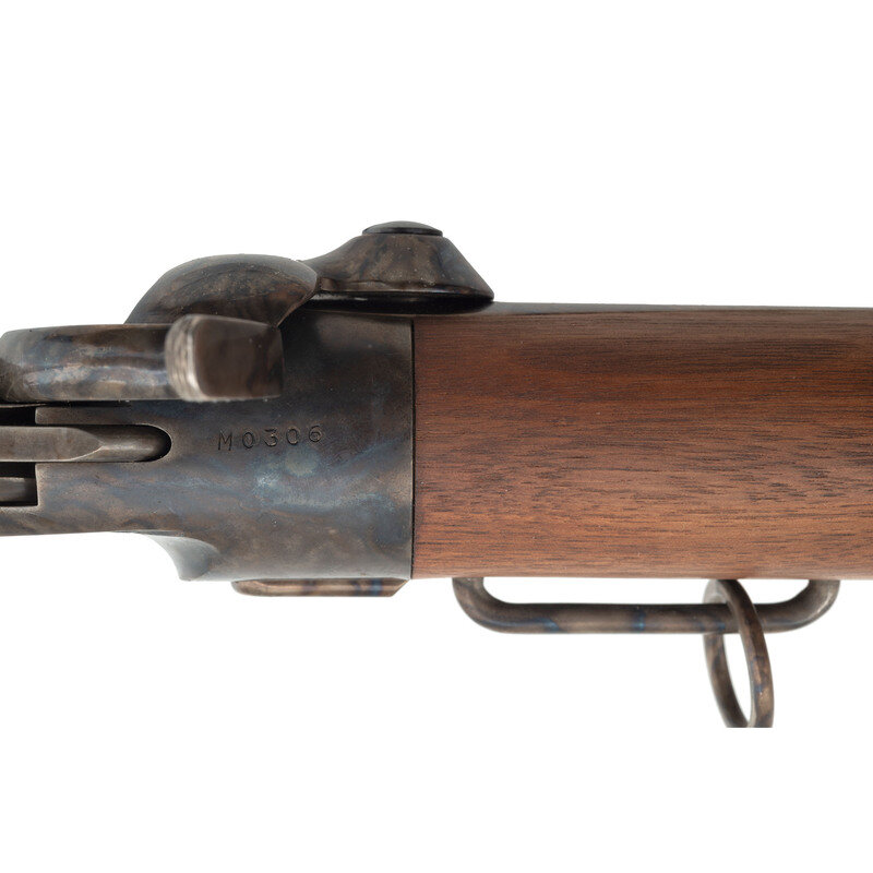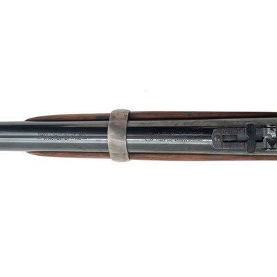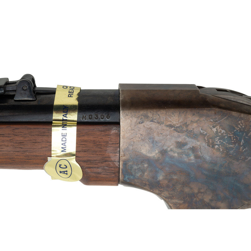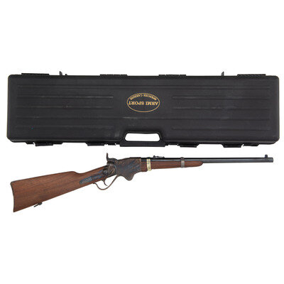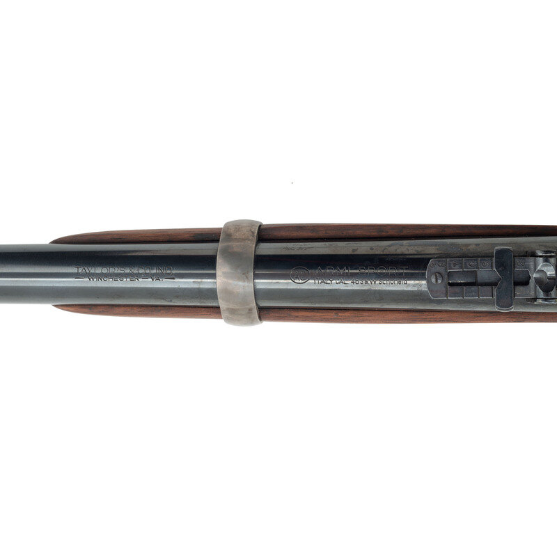 .45 S&W. 20" barrel length. SN: M0306. Color casehardened finish with blued barrel and screws mounting oil finished walnut stock, crescent butt, and saddle ring to left wrist. Lever action repeating rifle fed by an internal tube magazine in the stock. Sights consist of an adjustable rear ladder and front blade. Maker mark to the top of the barrel reads ARMI SPORT/ITALY CAL 45 S&W Schofield with importer mark reading TAYLOR'S & CO. INC./-WINCHESTER-VA.-. Italian smokeless powder firing proofs struck into the receiver. Forend retains a gold warning sticker, and the rifle comes in its original ARMI SPORT marked black plastic hard case with the owner's manual.