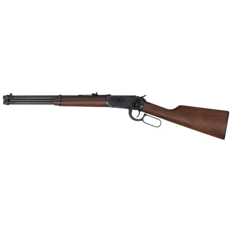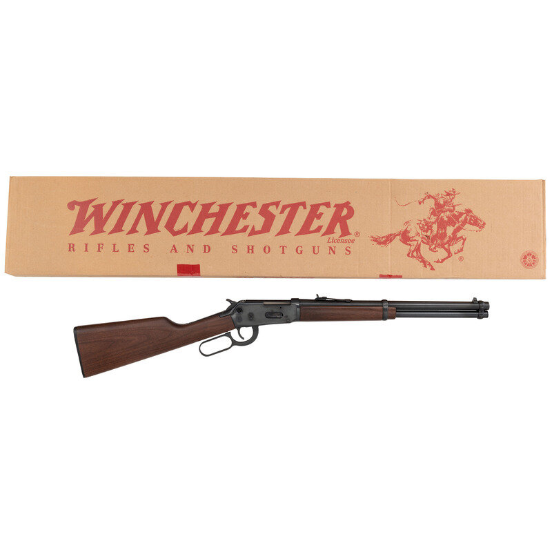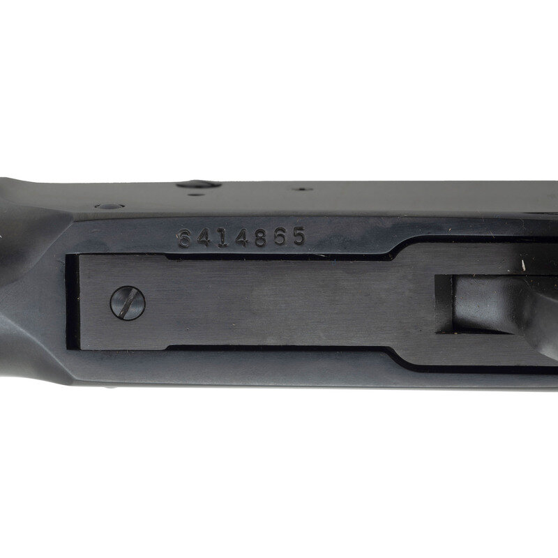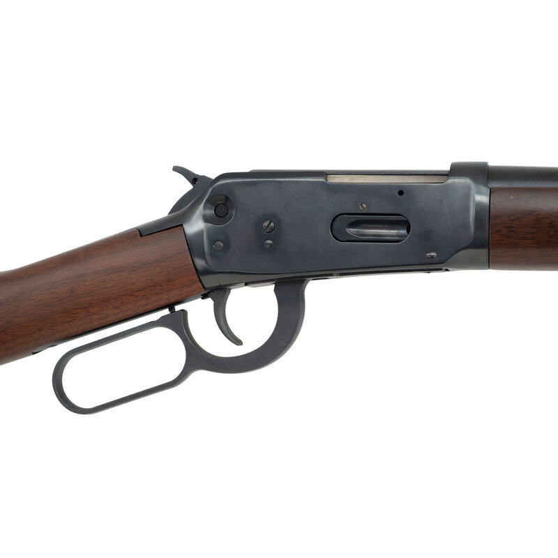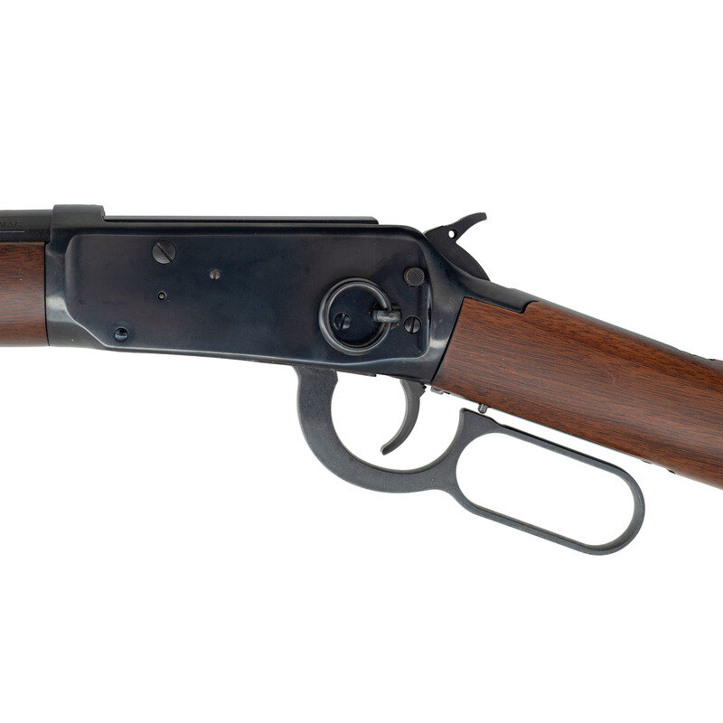 .44 Magnum. 20" barrel length. SN: 6414865. Blued metal finish. Two piece walnut stock has a plain straight grip and forearm. Lever action rifle with an adjustable notch rear sight, blade front sight, and full tube magazine. Item features an angular ejector and safety toggle to frame. Includes original box.